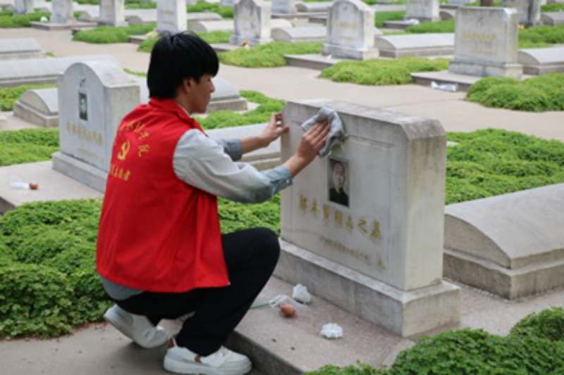 上午12点,祭扫活动准时开始。同学们身着整齐的服装有序地踏入郑州市烈士陵园。大家心怀敬重,拾级而上,现场氛围凝重。全体人员在烈士纪念场所鞠躬默哀,表达对先烈的无限缅怀与崇高敬意。鞠躬默哀仪式结束后,同学们手持鲜花依次上前献花,寄托无限哀思。随后,同学们分组行动,擦拭烈士墓碑、清扫园区落叶。清扫过程中,同学们手持工具,仔细清理墓碑上的杂物,每一个擦拭动作,都饱含着对革命先烈的深切敬意与敬仰。