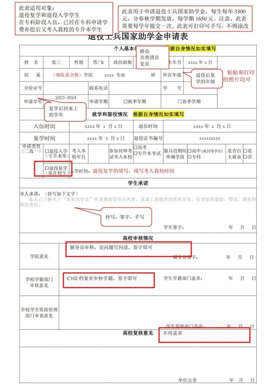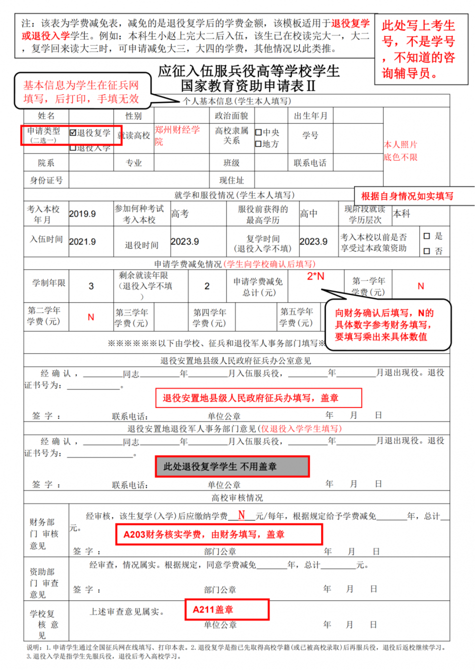 举例三:小王高考考取了yh8888银河,大一未就读,保留入学资格应征入伍,退役之后自愿复学,可申请大一至大四学费减免。此时需要填写《申请表Ⅱ》。(表中“申请类型”选择“退役复学”,专科生以此类推)