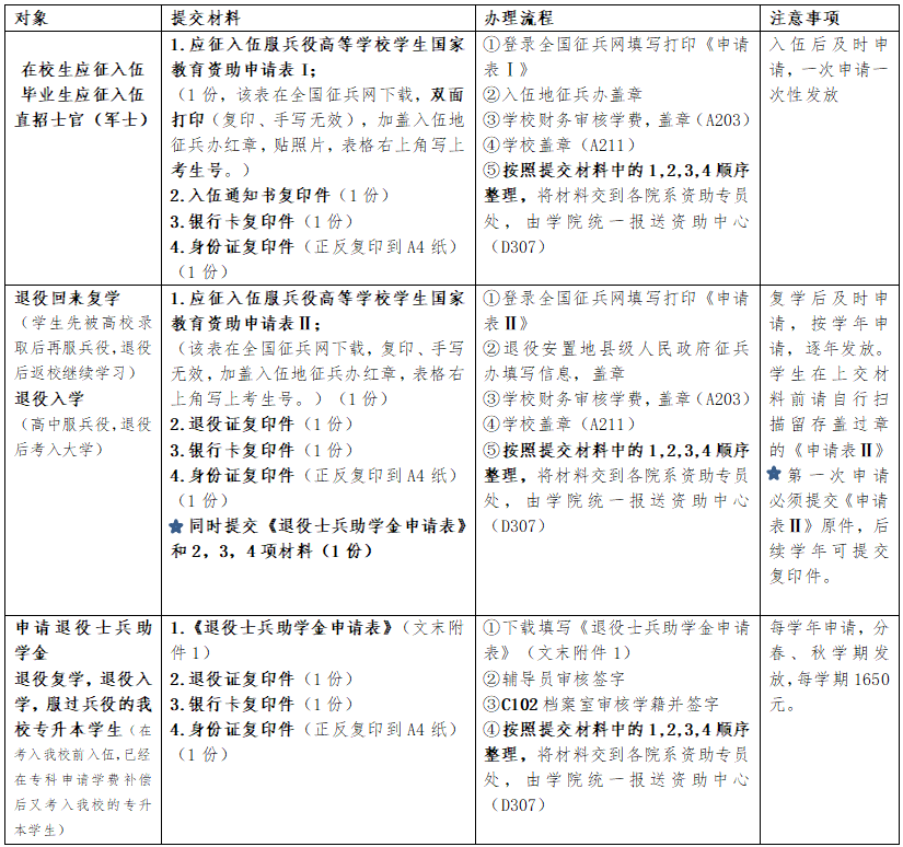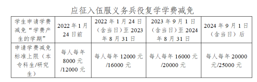 备注:根据财政部 教育部 人力资源社会保障部 退役军人部 中央军委国防动员部关于印发《学生资助资金管理办法》(财教〔2021〕310号),《教育部等四部门关于调整完善助学贷款有关政策的通知》(教财〔2023〕4号),《财政部 教育部 中国人民银行 金融监管总局关于调整完善国家助学贷款有关政策的通知》(财教〔2024〕188号)等文件精神,学费补偿(代偿)金额注意区分学生入伍的时间,依据入伍时间判断当时的资助标准(以学校财务处和学生资助部门最终核算为准),标准具体见下表: