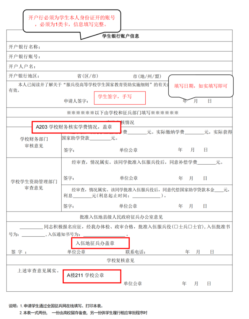 举例一:本科生小赵上完大二后入伍,在收到《入伍通知书》后,申请对其在校期间缴纳的学费(即大一、大二的学费)一次性补偿,此时需填写《申请表Ⅰ》;小赵退役后自愿复学,可申请大三、大四学费减免,此时需填写《申请表Ⅱ》表中“申请类型”选择“退役复学”。(根据自身实际情况类推,专科生以此类推)