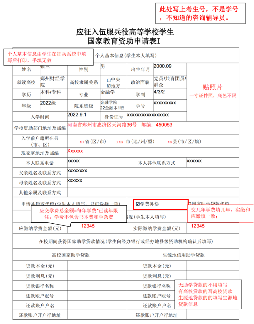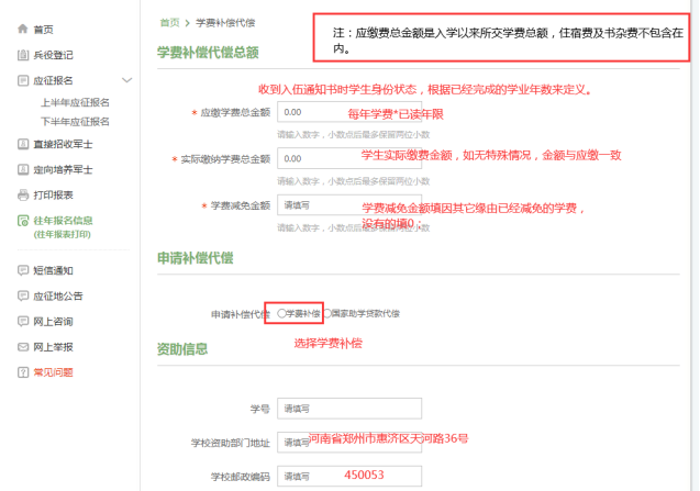 如:小赵,本科二年级上完后入伍,那么在校期间应缴学费就是在校两年所交的学费,实缴学费与应缴学费填写一致;小李,专科三年毕业后入伍,那么在校期间应缴学费就是三年所交学费的总和,实缴学费与应缴学费填写一致。