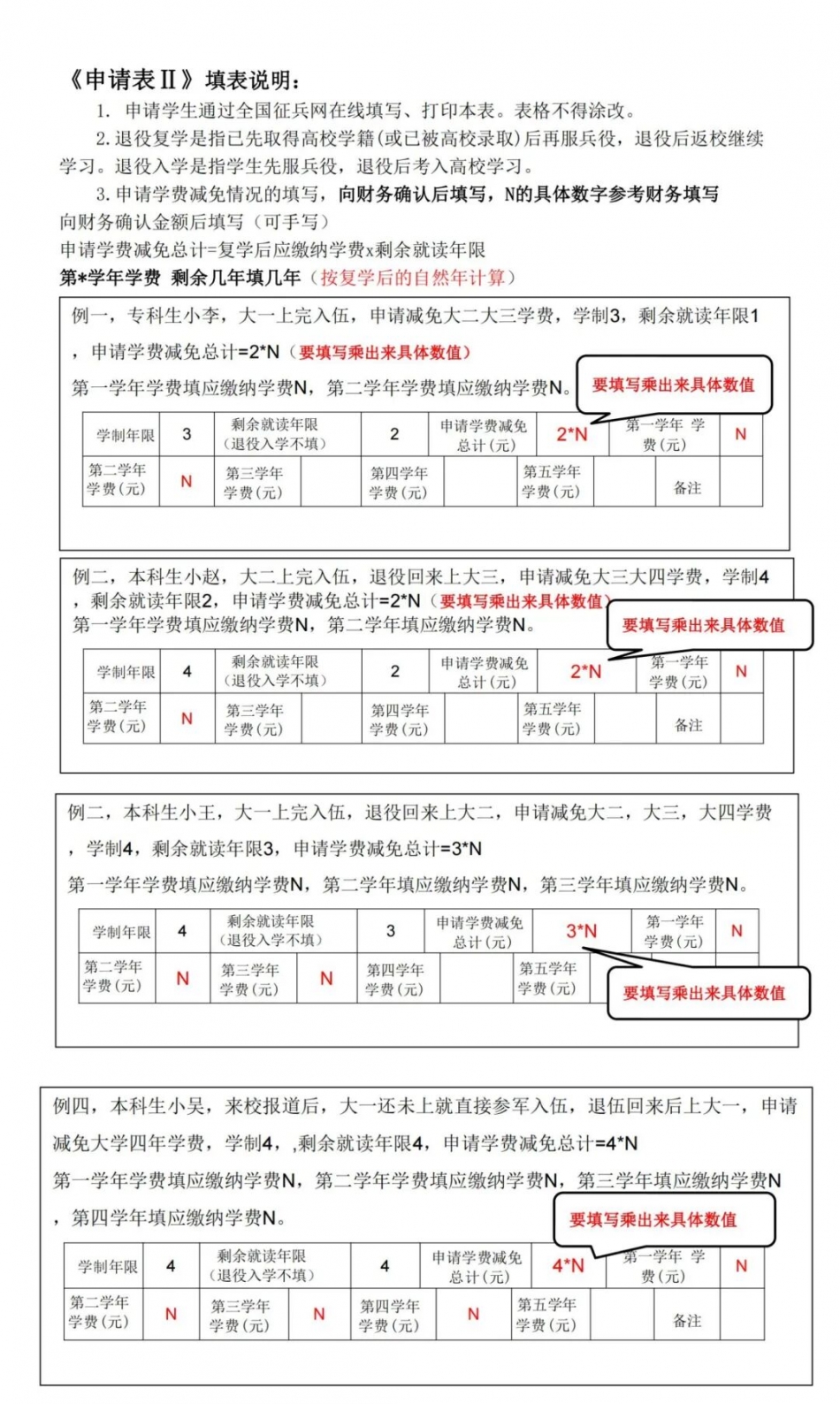 举例四:小吴在高中应征入伍,退役后参加高考或其它统招考试考入大学,到校注册报到后可申请学费减免。本科生、专科生均可申请学费减免,此时需填写《申请表Ⅱ》。(表中“申请类型”选择“退役入学”)
